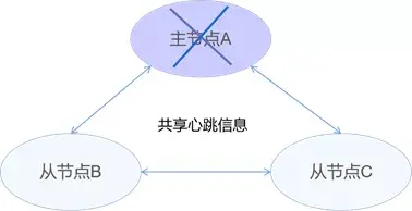 如图所示,一个3节点的复制组,包括:主节点A,从节点B,从节点C。在正常情况下,三个节点通过心跳共享状态信息。如果主节点A由于某种原因故障(服务器掉电/网络故障/磁盘故障等等)将自动降为从节点,集群开始重新选主。