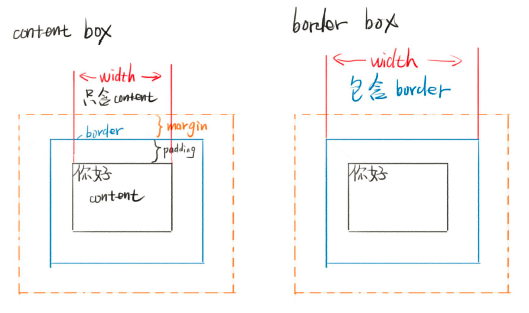 CSS 盒模型有两种,一种是 content-box 一种是 border-box。content-box 的宽度 width 表示内容区的宽度,不包含 padding 和 border;border-box 的宽度 width 表示内容区 + padding + border 的总和。一般优先使用后者。