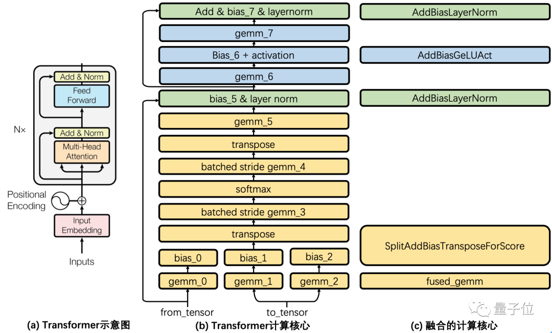 类似NVIDIA FasterTransformers方案,将所有GEMM运算之间的计算融合成一个调用核心。融合会带来两个好处,一是减少了内存访问开销,二是减少多线程启动开销。