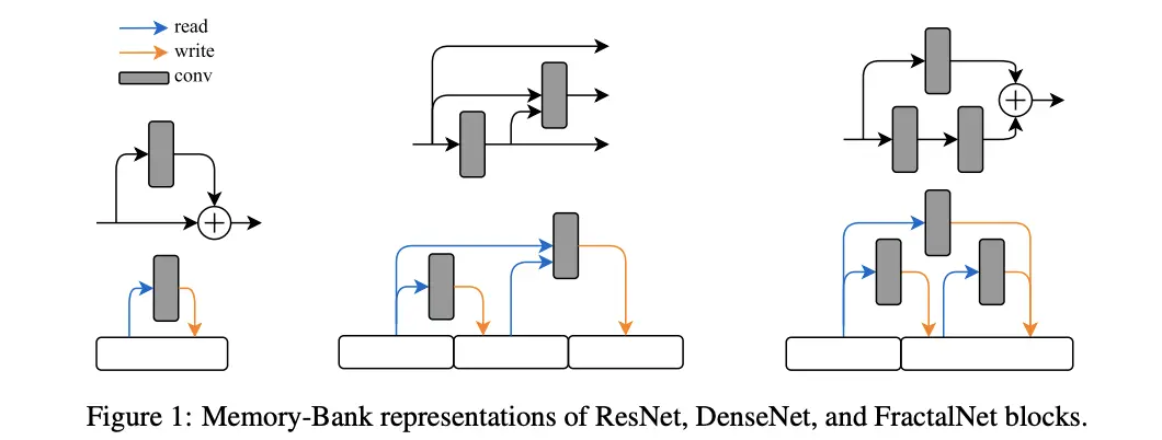 为了能够生成多种的网络结构并且方便编码输入HyperNet,论文采用存储体(memory-bank)的方式进行网络表示,将网络视为一系列初始为0的存储体,每层的操作视为对存储体的读写。对于单分支网络,网络包含一个大的存储体,每次操作都覆盖存储体的内容(对ResNet是相加),对于DenseNet的多分枝网络,则读取所有前面的存储体,然后将结果写入空的存储体,而对于FractalNet,则构造更为复杂。