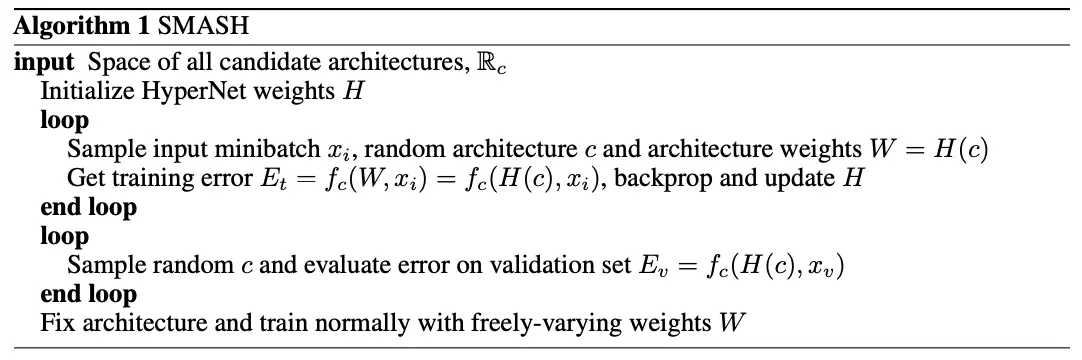 SMASH的逻辑如算法1,核心是通过辅助网络HyperNet根据不同的网络结构生成对应的权重,然后根据验证集表现进行排序: