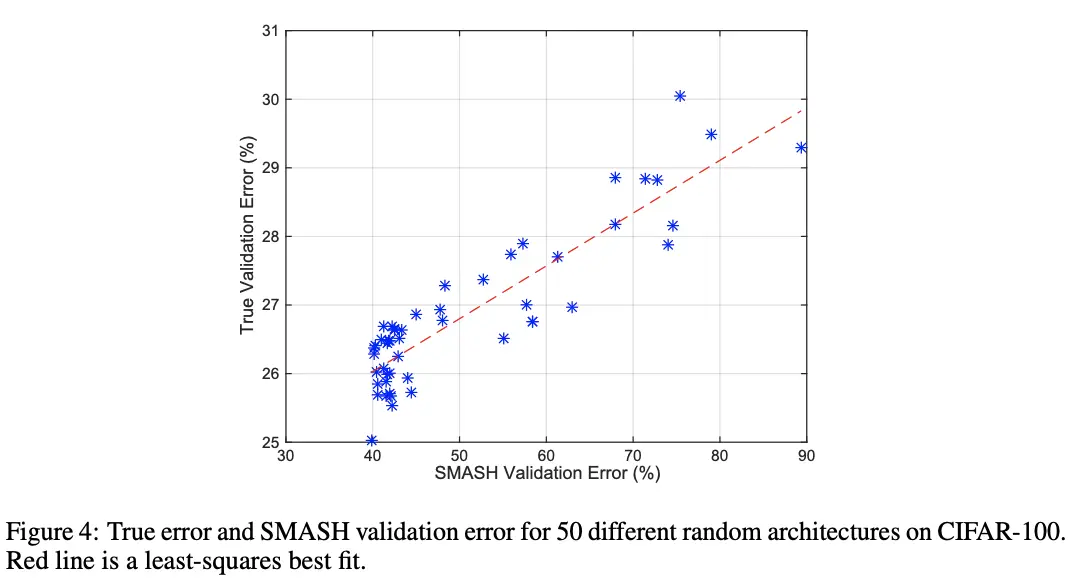 论文认为,只要HyperNet学习到如何生成有效的权重,那么在验证集上,使用生成权重的网络的准确率会和正常训练的网络的准确率产生关联,此时,网络的结构将会变成影响验证集准确率的主要因子。