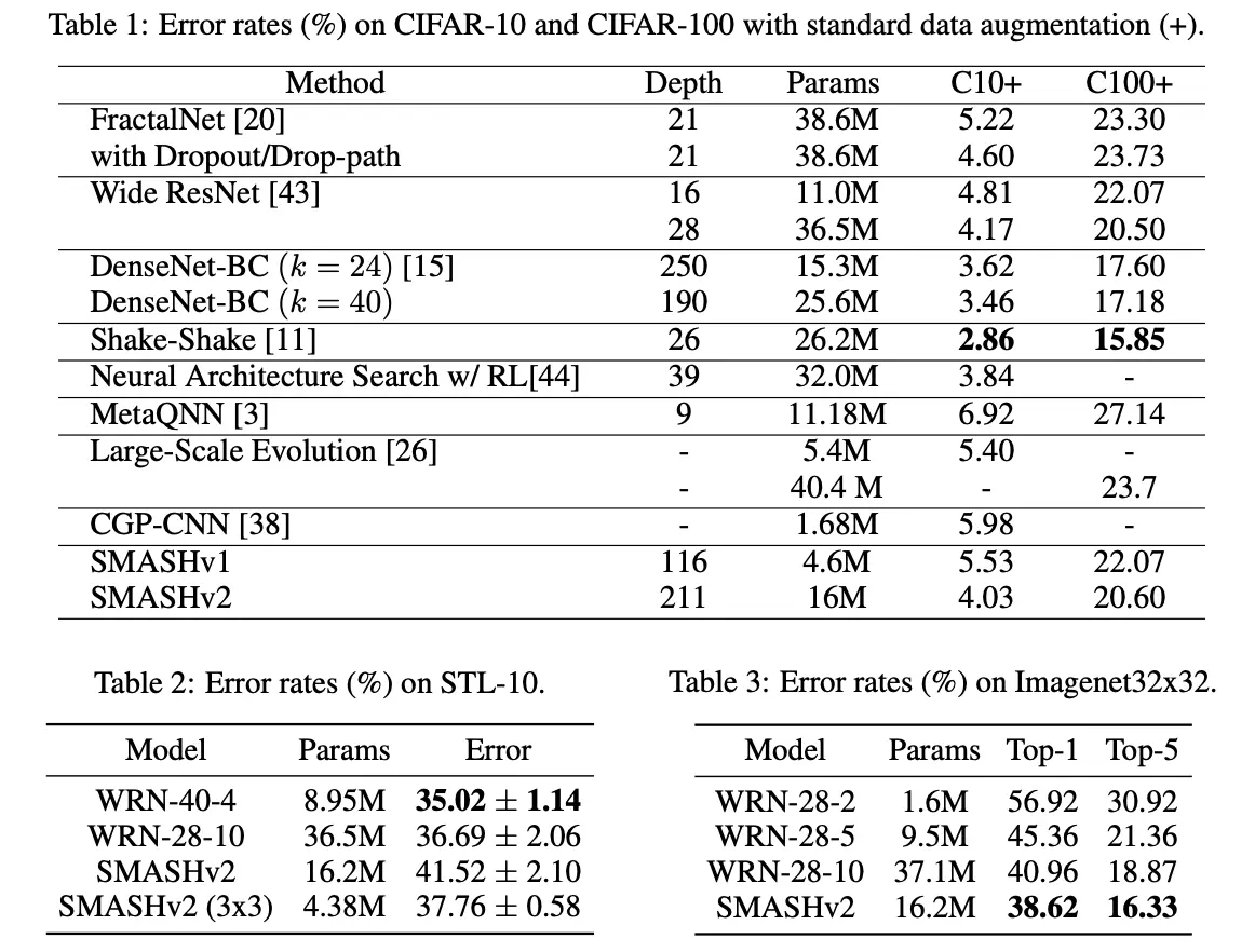 在设计时,为了让网络更多地采用HyperNet产生的权重,仅在下采样层中以及输出层之前使用BatchNorm,主要由于很难通过生成的方式产生这种运行时统计的结果。为了弥补这一举措,使用WeightNorm的改进版,将生成的卷积核除以其欧几里得范数进行正则化(不是单独正则化各channel),这对SMASH十分有效,仅带来些许的性能下降。