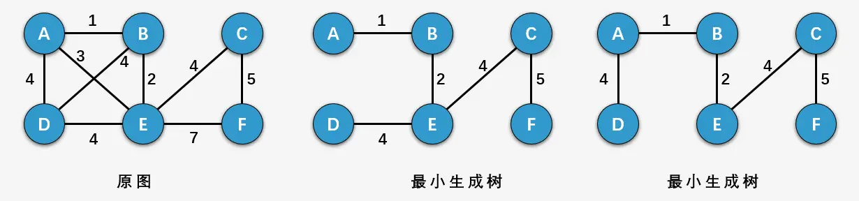 上图中,原来的带权图可以生成左侧的两个最小生成树,这两颗最小生成树的权值之和最小,且包含原图中的所有顶点。