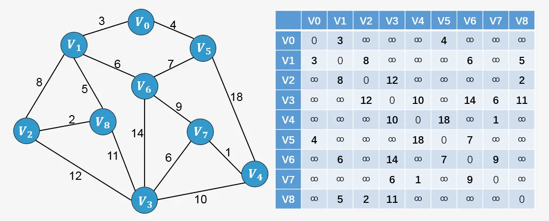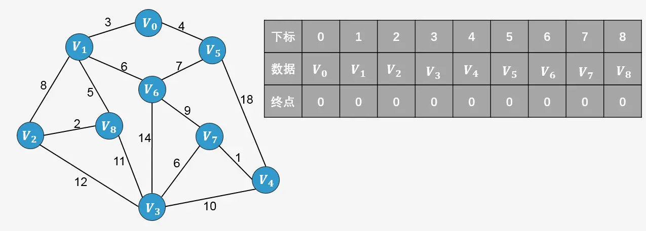 lowcost[0] = 0; // V0作为最小生成树的根开始遍历,权值为0(0,3,*,*,*,4,*,*,*)