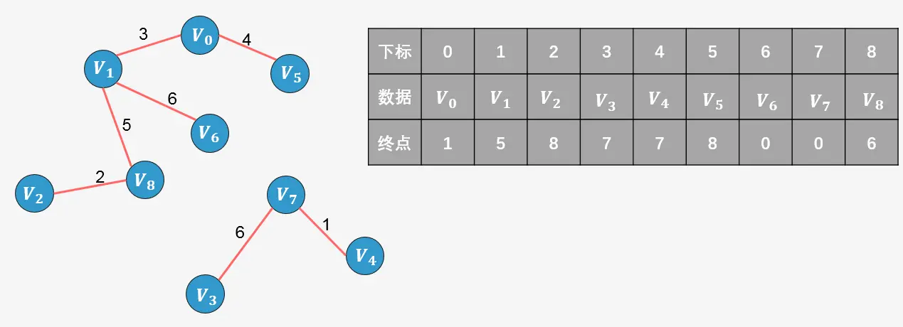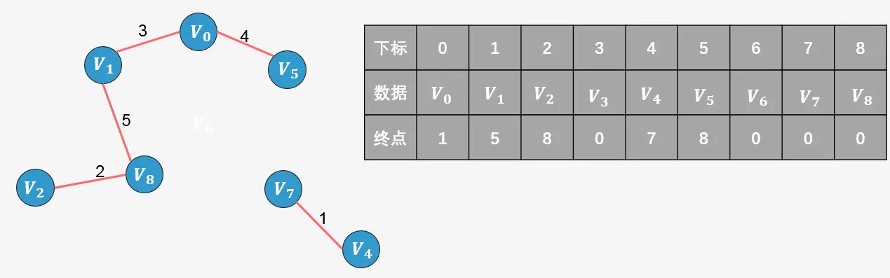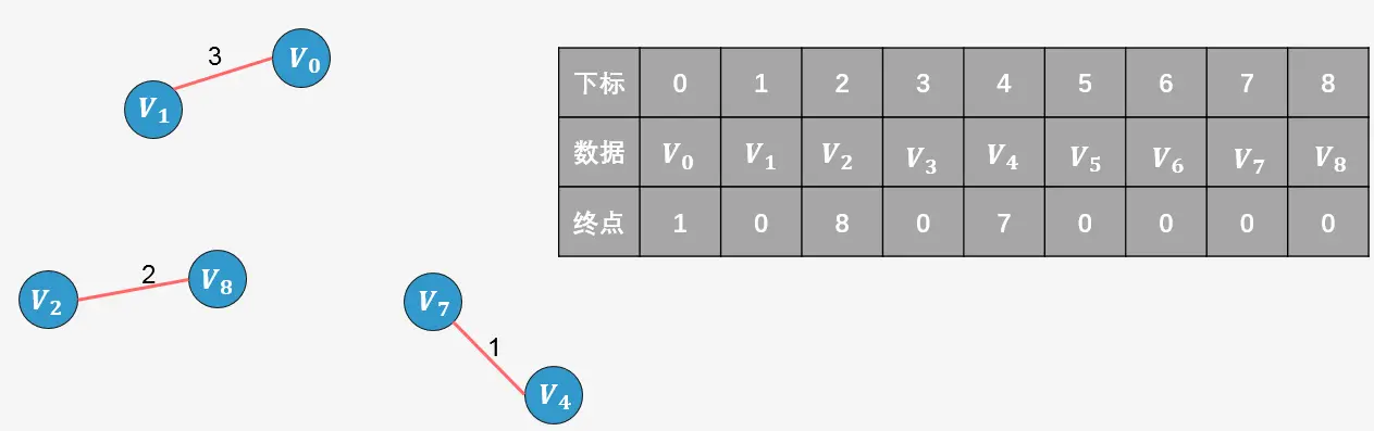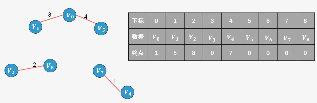 所谓终点,就是将所有顶点按照从小到大的顺序排列好之后;某个顶点的终点就是"与它连通的最大顶点"。看下图,我们可以对图中顶点进行排序,排序后的顶点存放在一个数组中,每一个顶点则对应一个下标,同样的我们针对排序后的数组创建一个顶点的终点数组,初始时图中的每一个顶点是一棵树,每一个顶点的终点初始化为自身,我们用0来表示。
