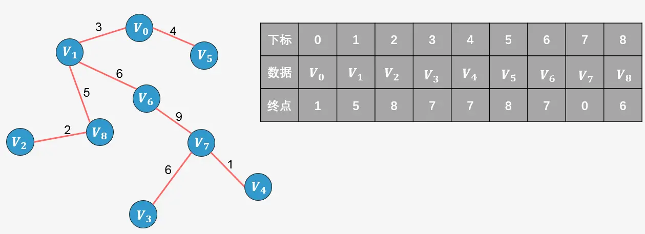 将 **6的终点更新为7**;此时已经包含了图中顶点个数9减1条边,算法停止。