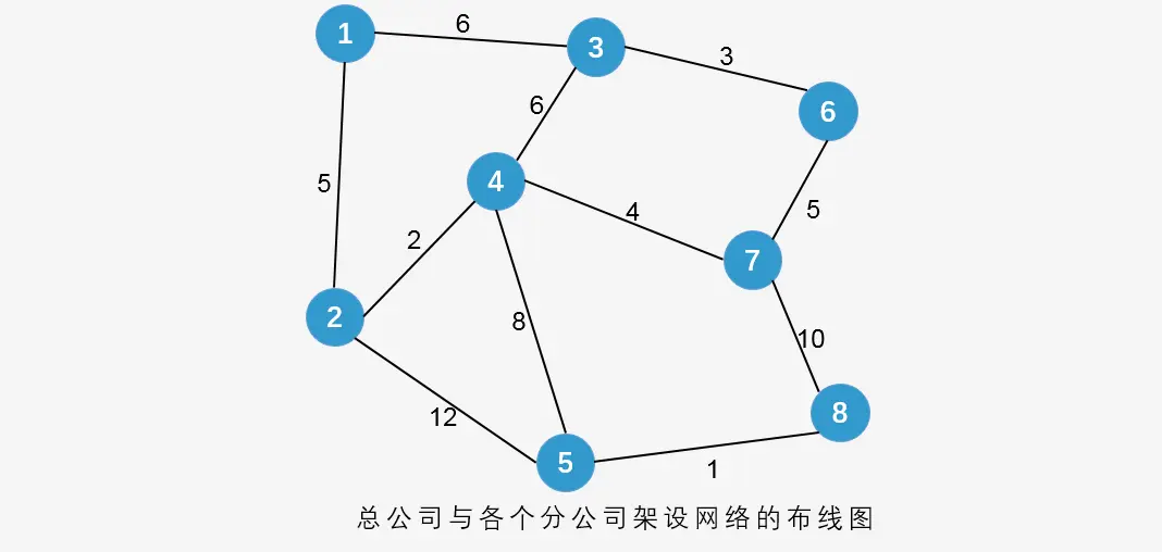 某公司规模不断扩大,在全国各地设立了多个分公司,为了提高公司的工作效率,使各分公司之间的信息可以更快、更准确的进行交流,该公司决定要在各分公司之间架设网络,由于地理位置和距离等其他因素,使各个分公司之间架设网线的费用不同,公司想各分公司之间架设网线的费用降到最低,那么应该怎样来设计各分公司及总公司之间的线路?该公司的所有分公司及总公司的所在位置如下图所示,顶点代表位置及公司名称,边表示可以架设网线的路线,边上的数字代表架设该网线所需要的各种花费的总和。这样就构成了一个带权的连通图,从而问题就转化为求所得到的带权连通图的最小生成树。