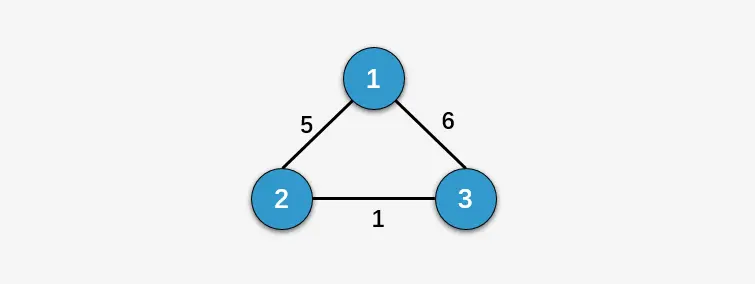 我们以示例1为例,其中输入N=3,表示图中包含3个顶点,conections = [[1,2,5],[1,3,6],[2,3,1]],[1,2,5]表示顶点1和2的权值为5,根据输入可以得到下图: