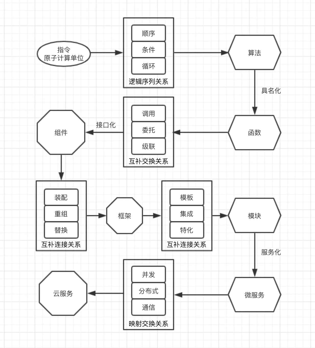 函数、组件、框架、模块、微服务、云服务是在各个层次上的可复用实体。在每个层次上,互补、连接、交换关系都是大规模复用的基本形式关系,在组合术语上略有侧重和不同。