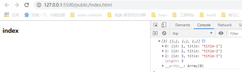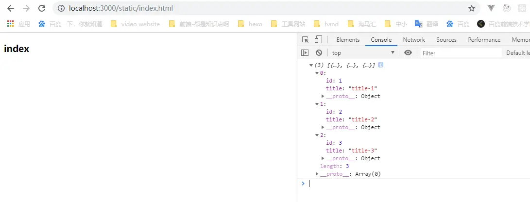 上述在静态文件 index.html 中, 请求了接口 http://localhost:3000/data 这个数据, 可以看下控制台输出, 拿到了数据