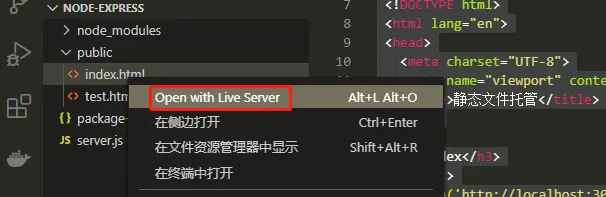 通过 live server 插件, 直接启动另外的一个服务器来打开静态文件 index.html