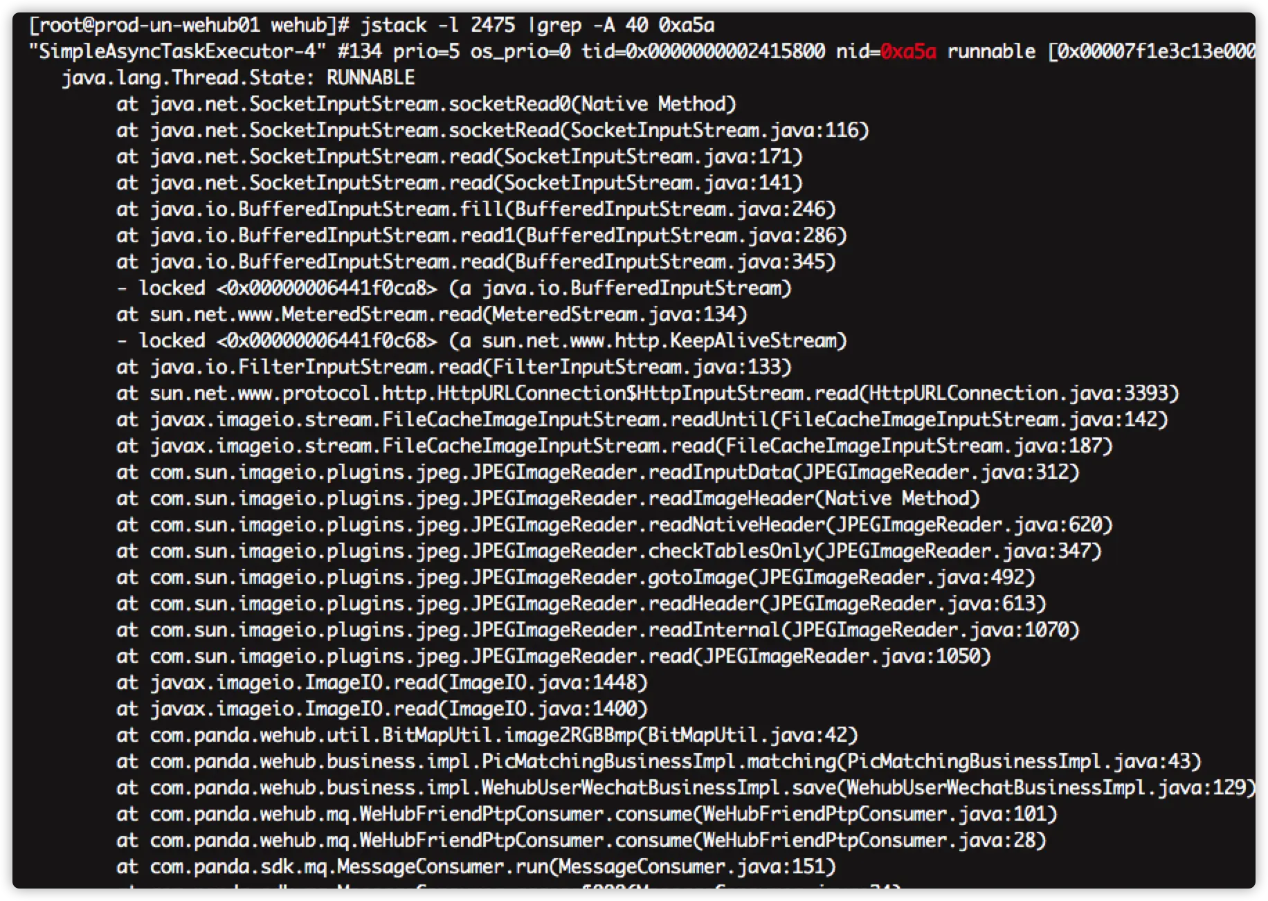 排查过程:我们是在处理完消息后,再向rabbitMq确认消息。消费消息逻辑有try/catch 保护,肯定能走到确认逻辑块。反复研究代码,未发现不能ack的漏洞。之后想着去看线程堆栈,发现了异常,有消息线程挂起了。