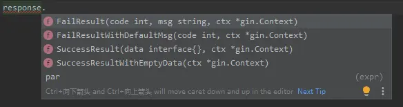 注意,在这个response包中,只有返回结果的几个函数:SuccessResultWithEmptyData、SuccessResult、FailResultWithDefaultMsg、FailResult是给外部函数调用的,其他的函数是内部调用的。所以注意函数名第一个字母的大小写,来设置公有还是私有。