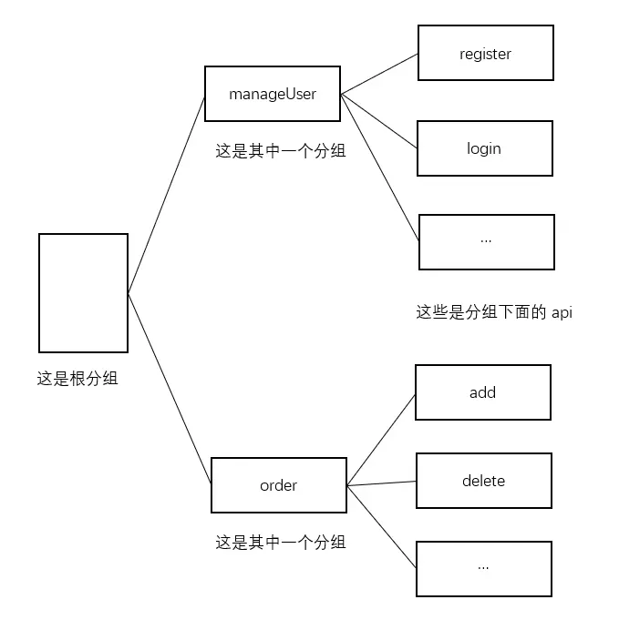 我们先设置了一个空的路由分组,这个分组是作为根分组存在的。然后,我们把各个模块作为这个分组的子分组。举个例子:我们的项目中,有用户相关的模块,有订单相关的模块,那么这里的一个模块,就是一个分组,一个分组下面,有多个接口。