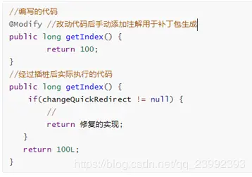 注意是每个方法都要插入,最终生成的class肯定会代码增加不少吧。如果需要修改原来方法的逻辑,好像只需要修改changeQuickRedict的值就可以了(这个是我猜测的,等下看源码验证)。它也可以做到即时生效。