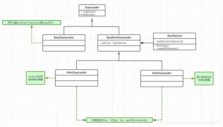 4.BaseDexClassLoader:提供了findClass()的实现。它的两个子类都是使用它的findClass()