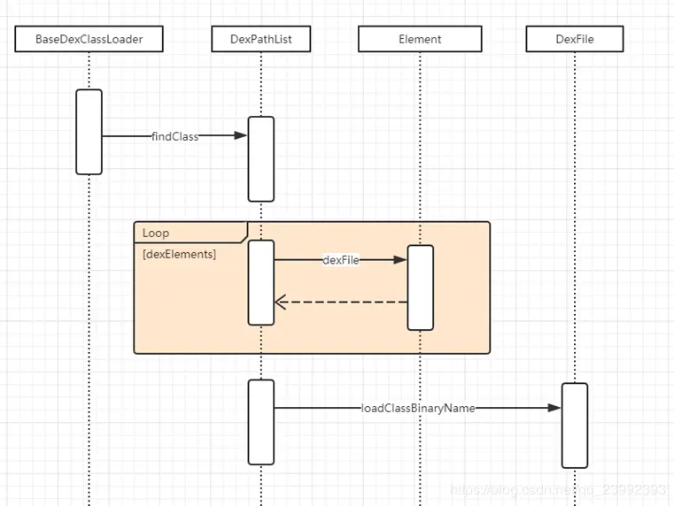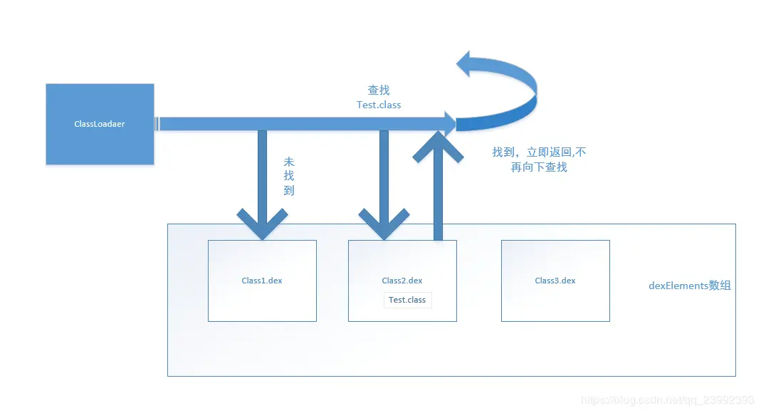 遍历dexElements的数组,在每一个节点中寻找要加载的class,如果找到,停止遍历,立即返回。