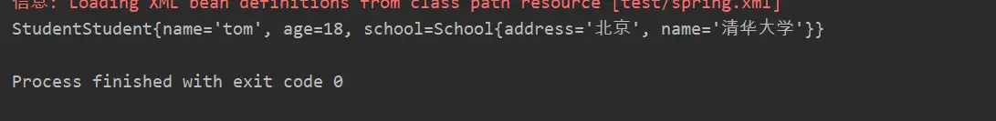 由上可以看出,引用数据类型是将本来value的地方改为ref =“bean的id” 同时将声明的School类进行赋值 运行test