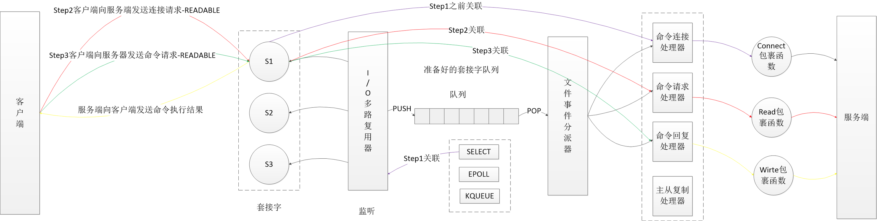 文件事件处理器组件框架图: 一个完整调用: step1服务端监听客户端连接请求 step2客户端请求与服务端建立连接 step3客户端发送命令请求到服务端 step4客户端读取服务端返回客户端命令执行结果 整个过程如下图所示:
