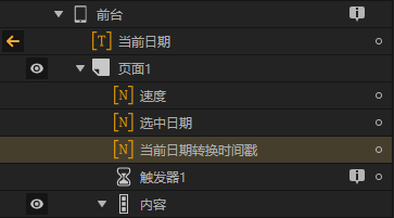 下图是案例中使用的几个变量,“当前日期”是存储2020-04-26格式的当前日期,数值变量“选中日期”和“当前日期转换时间戳”是对应日期时间戳的值,另外在案例中我们可以设置动画的时长,所以需要添加一个数值变量“速度”,即触发器每次触发的变化量。