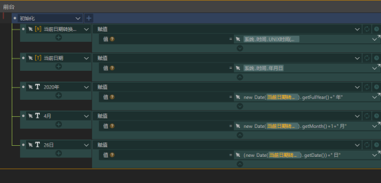 在案例初始化时,我们获取系统当前时间的时间戳,从中提取年、月、日展示出来,并将时间戳值保存在“当前日期转换时间戳”中。