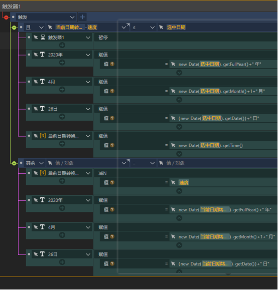在触发器的触发事件里,我们先判断当前日期的时间戳减去速度后是否小于选中日期,如果小于则暂停触发器然后将选中日期的年、月、日提取出来显示,动画也就运行结束;如果不是则用当前日期时间戳减去速度,再获取年、月、日展示出来,这样循环播放就有了一个时间倒退的效果。