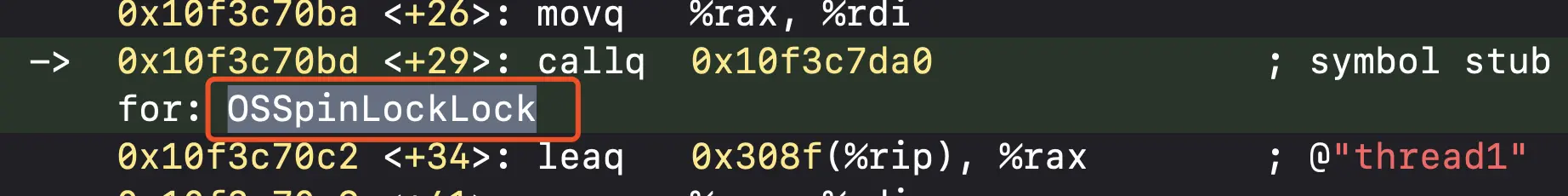断点在thread1方法,调用test方法,使用LLDB指令si一步一步执行汇编代码。首先进入OSSpinLockLock方法