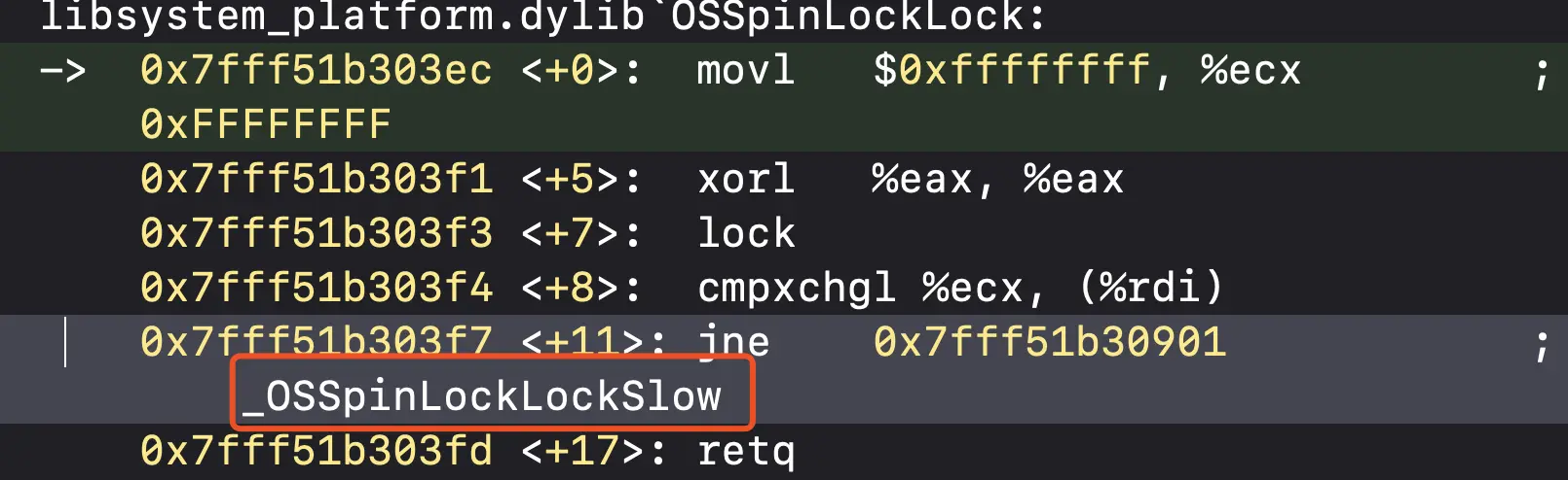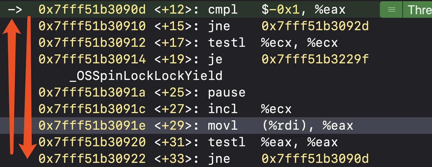 进入_OSSpinLockLockSlow函数,执行si指令,会发现,程序一直在循环执行一段汇编指令,如下: