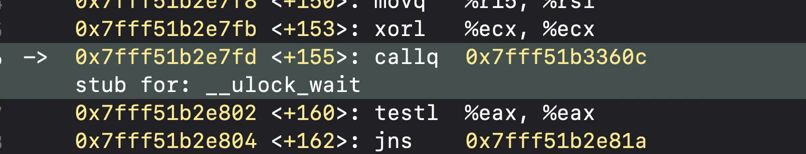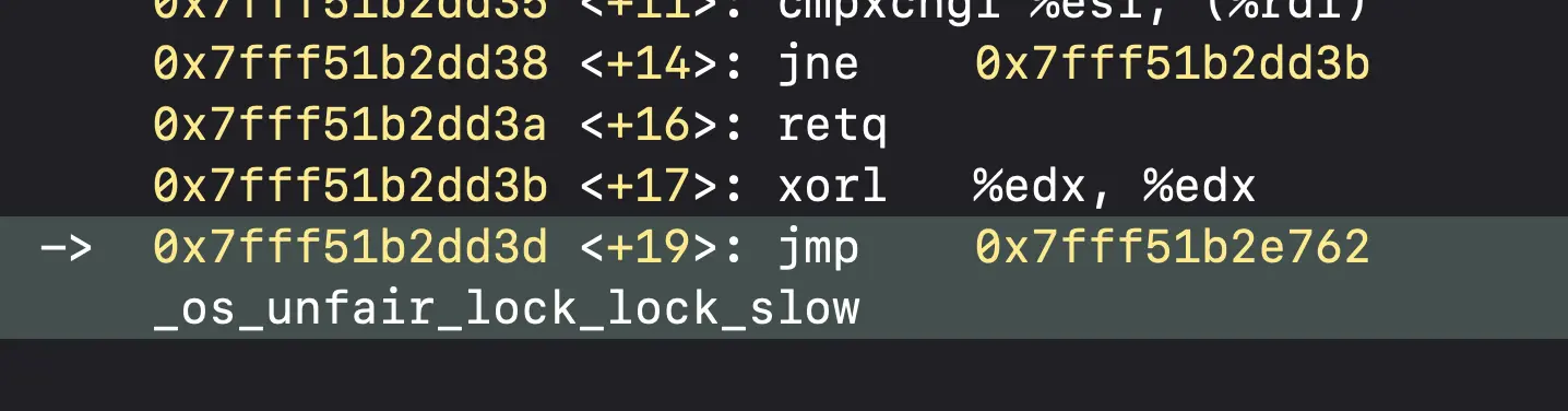 将Demo中的锁换成os_unfair_lock,然后用相同的方式跟踪汇编代码。首先是进入os_unfair_lock_lock方法,方法内部会调用_os_unfair_lock_lock_slow函数