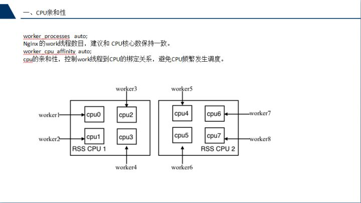 Nginx运行时会启用 1 个 master 进程及多个 worker 进程,worker 进程负责处理请求,如果 worker 进程在多核 CPU 中发生频繁的调度就会损耗性能。