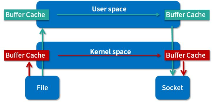 如图所示,我们先来看下没有零拷贝时文件传输是什么样子的?首先 Nginx 在处理文件时,会将文件传入操作系统内核态的 Buffer Cache,然后传递到操作系统上层的用户态,经用户态的 Buffer Cache 再传回内核态中,最后通过 Socket 将文件转发出去。