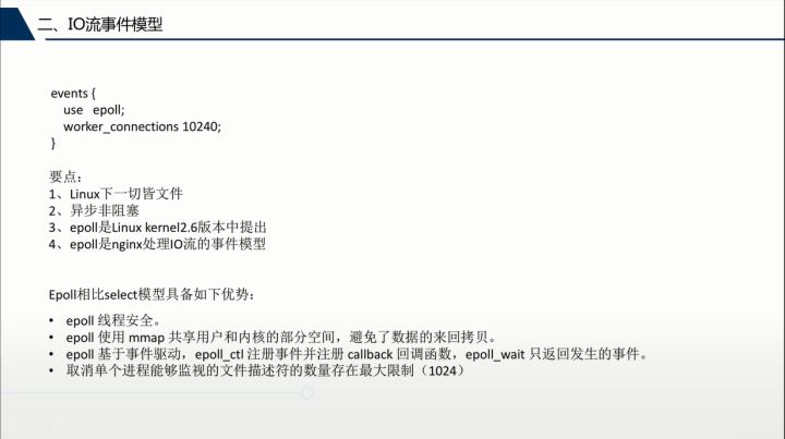 其次,在Nginx 处理大规模请求的时候,为了提高并发效率需要采用异步非阻塞模型,这又和 epoll 有什么关系呢?epoll 本身是以异步非阻塞模型来处理请求流中的事件流。