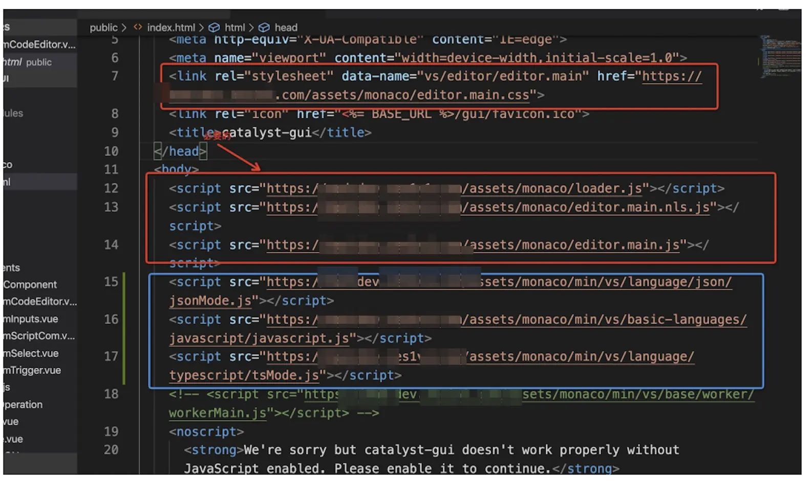 其中红框里的是必要的引入文件,蓝色框里的是你需要用到哪种语言就引入哪种语言的mode, 这样就可以按需引入了, 而且对打包也不有什么影响