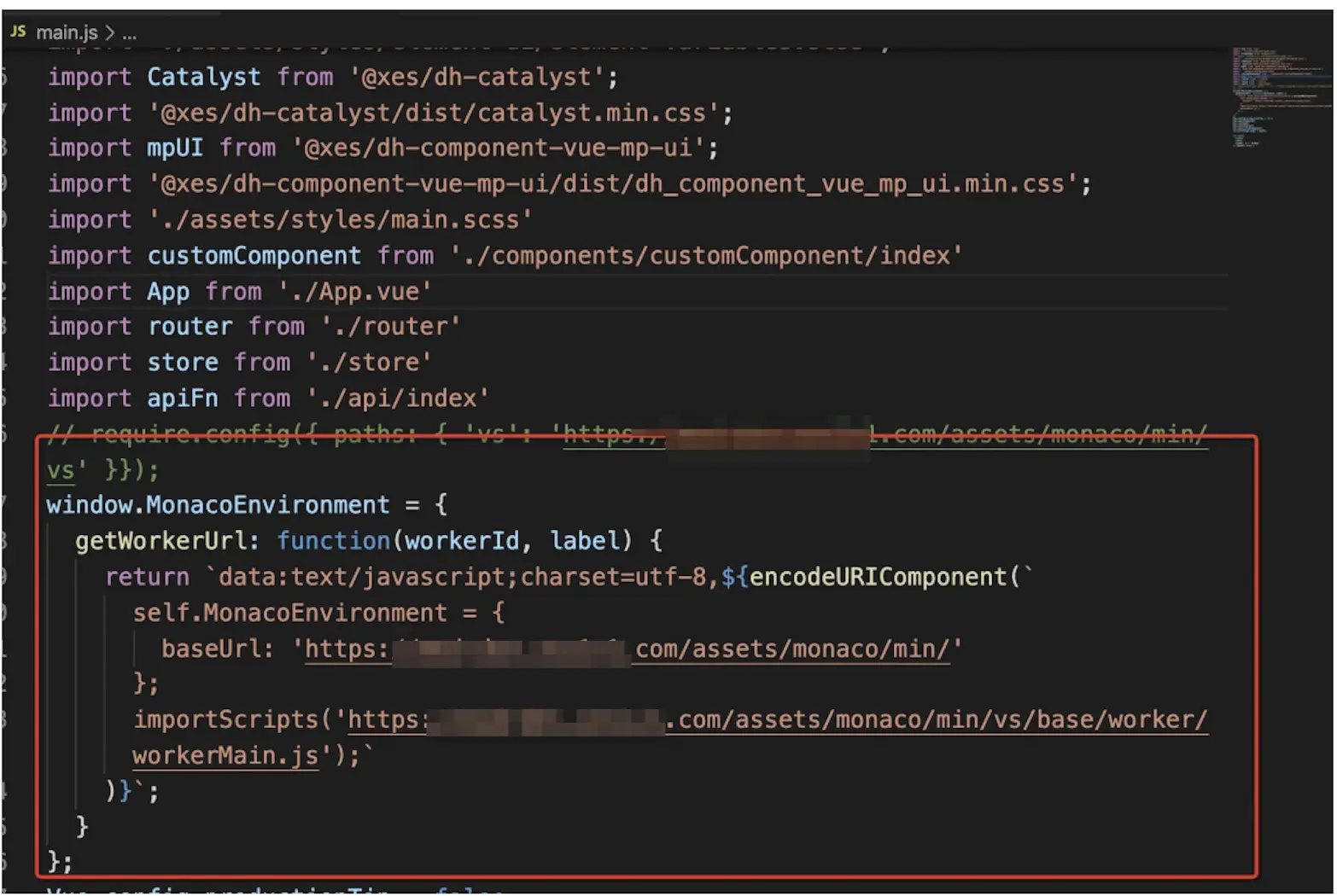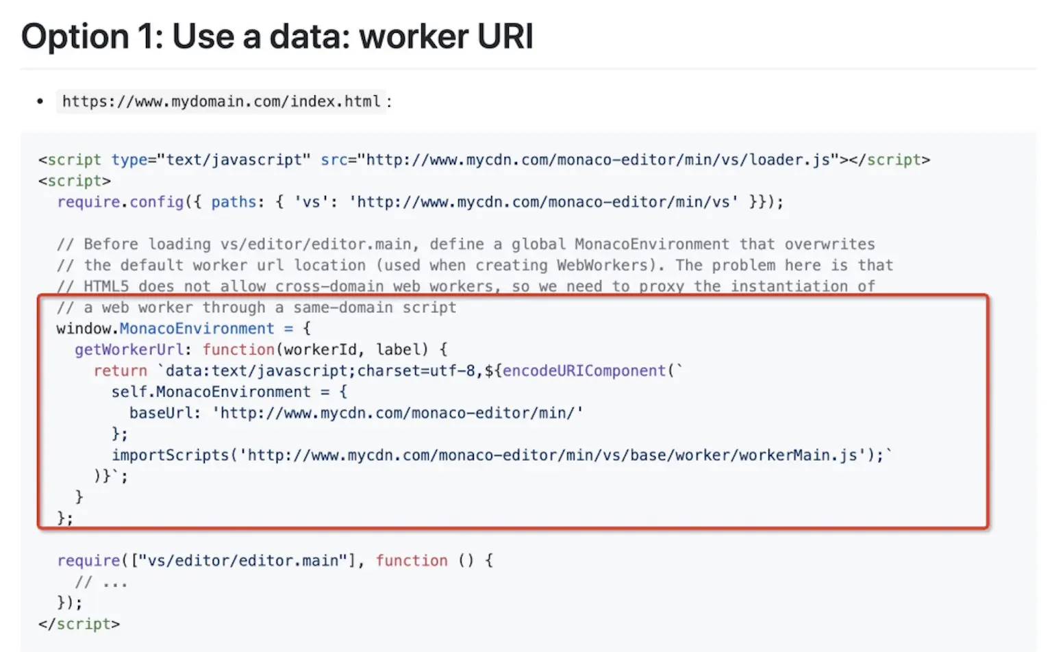 本以为这样引入就完美了,没想到项目启动后代码提示功能全没了,代码的错误校验功能也没了,最中意的功能居然使用不了....打开浏览器的控制台发现报出创建webWorker跨域的警告;经过一番搜索,我发现Monaco Editor这个库的代码提示和错误检查功能会用到内置的词法解析器和语法解析器,而这两个又很耗费性能,所以它采用了开始webWorker来进行处理,而不在主线程中去做,找了很久解决跨域的办法,最终发现官方的github给出了解决方案