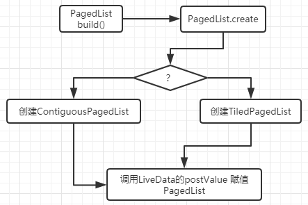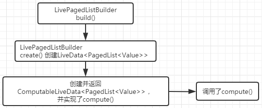 获得了DataSource.Factory,工厂创建数据源DataSource,通过LivePagedListBuilder 的build 方法获得LiveData<PagedList<Value>>,还对分页加载进行了相关配置,例如指定pageSize 。