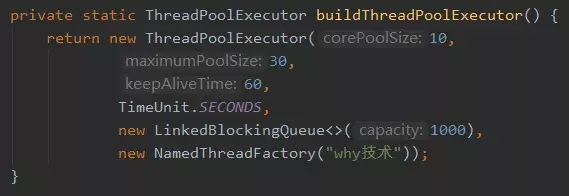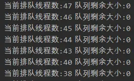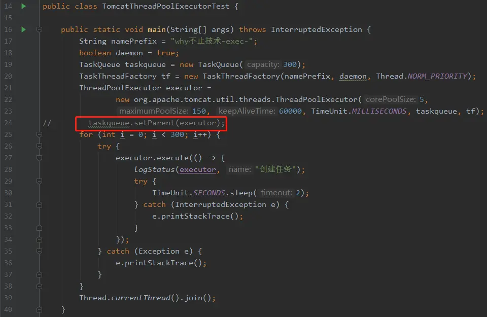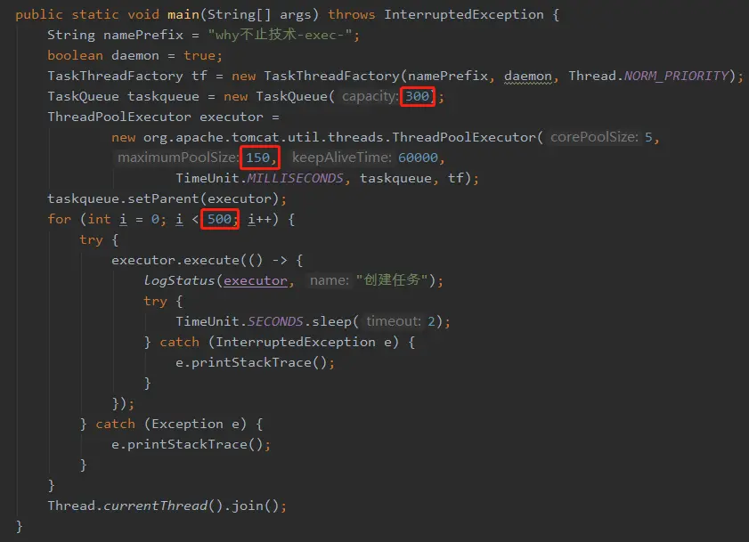 public class TomcatThreadPoolExecutorTest {public static void main(String[] args) throws InterruptedException { String namePrefix = "why不止技术-exec-"; boolean daemon = true; TaskQueue taskqueue = new TaskQueue(300); TaskThreadFactory tf = new TaskThreadFactory(namePrefix, daemon, Thread.NORM_PRIORITY); ThreadPoolExecutor executor = new ThreadPoolExecutor(5, 150, 60000, TimeUnit.MILLISECONDS, taskqueue, tf); //taskqueue.setParent(executor); for (int i = 0; i < 300; i++) { try { executor.execute(() -> { logStatus(executor, "创建任务"); try { TimeUnit.SECONDS.sleep(2); } catch (InterruptedException e) { e.printStackTrace(); } }); } catch (Exception e) { e.printStackTrace(); } } Thread.currentThread().join(); } private static void logStatus(ThreadPoolExecutor executor, String name) { TaskQueue queue = (TaskQueue) executor.getQueue(); System.out.println(Thread.currentThread().getName() + "-" + name + "-:" + "核心线程数:" + executor.getCorePoolSize() + "\t活动线程数:" + executor.getActiveCount() + "\t最大线程数:" + executor.getMaximumPoolSize() + "\t总任务数:" + executor.getTaskCount() + "\t当前排队线程数:" + queue.size() + "\t队列剩余大小:" + queue.remainingCapacity()); }