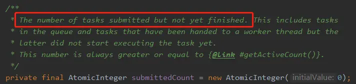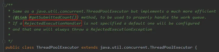 看一下 Tomcat 的 ThreadPoolExecuteor注释,里面提到了两个点,一是已提交总数,二是拒绝策略。后面都会讲到。