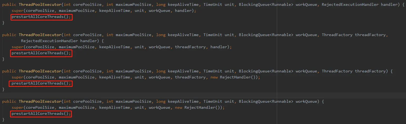 从源码可以看出,不管你调用哪一个线程池构造方法,都会去调用 prestartAllCoreThreads 方法。