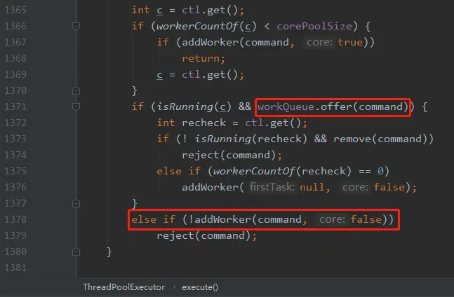 在截图的 1371 行,如果没有把任务成功放到队列里面(前提是线程池是运行状态),则会执行 1378 行的逻辑,而这个逻辑,就是创建非核心线程的逻辑。