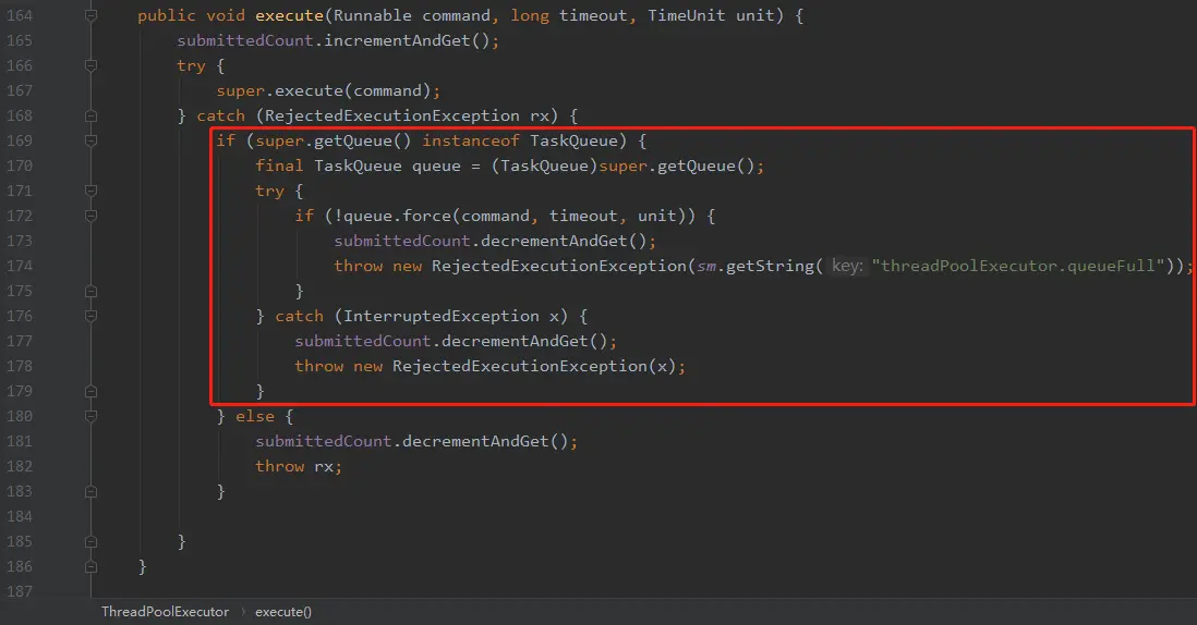如果你对 JDK 线程池的源码熟悉一点的话,你大概能猜到 Tomcat 肯定是在控制新建线程的地方做了手脚,也就是下面这个地方: