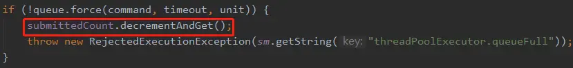 如果没有成功加入队列,则抛出异常,并维护 submittedCount 参数。