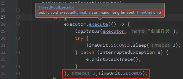 然后再去运行,因为队列满了后,触发拒绝异常,然后等 3 秒再去提交任务。而我们提交的一个任务 2 秒就能被执行完。