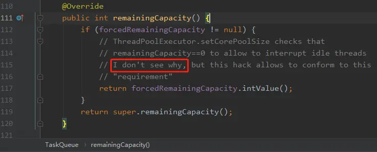 注释上面写的原因是JDK ThreadPoolExecutor.setCorePoolSize 方法会去检查 remainingCapacity 是否为 0。
