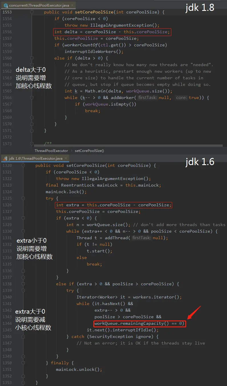 可以看到,调用 setCorePoolSize 方法之前,作者直接把 forcedRemainingCapacity 参数设置为了 0。