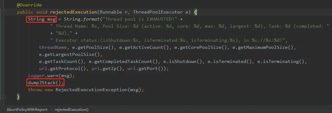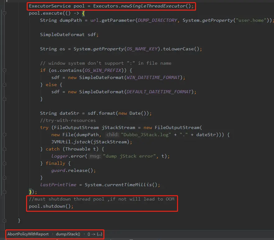 在这个方法里面,他用了 JDK 默认的线程池,去异常 Dump 线程。
