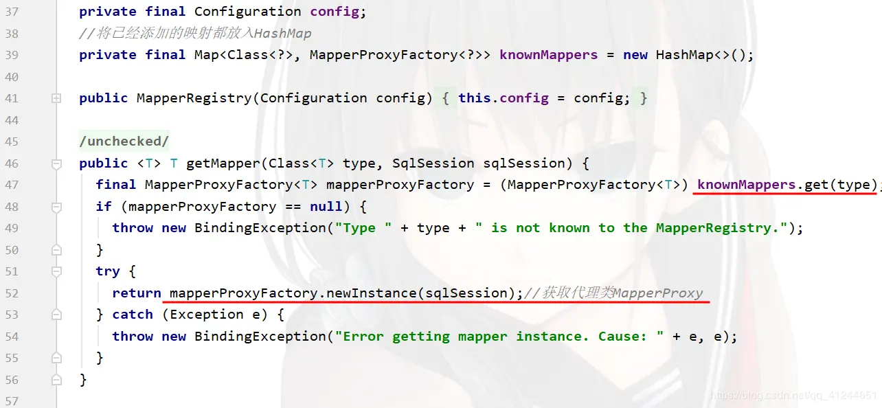 protected final MapperRegistry mapperRegistry = new MapperRegistry(this);是Configuration的一个属性,它内部维护了一个private final Map<Class<?>, MapperProxyFactory<?>> knownMappers = new HashMap<>();用以存储已经存在的Mapper映射信息;这个操作是在初始化配置信息中就已经加载了,这个我们在之前的源码分析中已分析,可参考:源码分析篇全局配置文件初始化;- 当我们的程序一启动,这个