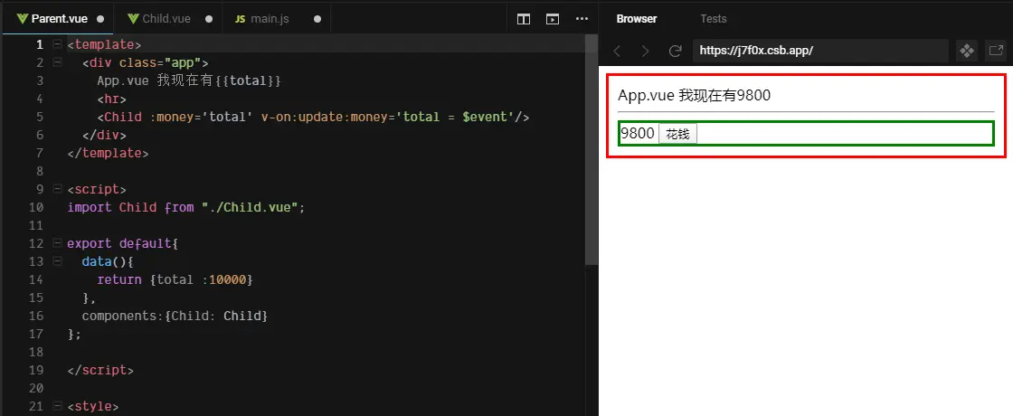 <Child :money='total' v-on:update:money='total = $event'/> //监听money的变化其中$event是vue内置的,作用是储存money-100的值。