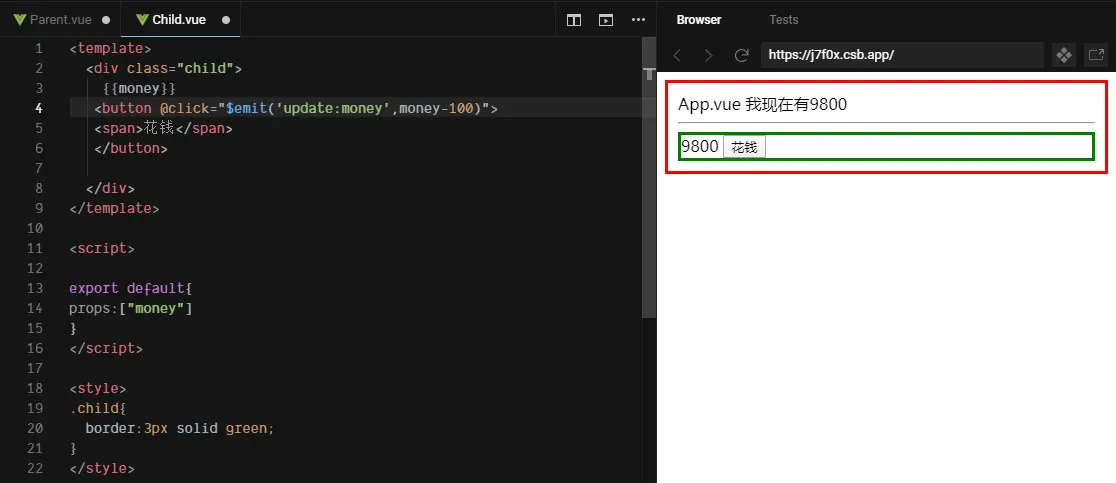 <button @click="$emit('update:money',money-100)"> 发布事件,意思是点下“花钱”按钮,对应的值要变为money-100,此时就需要修改props中的money,而父组件为了获取变化后的数据,需要监听子组件