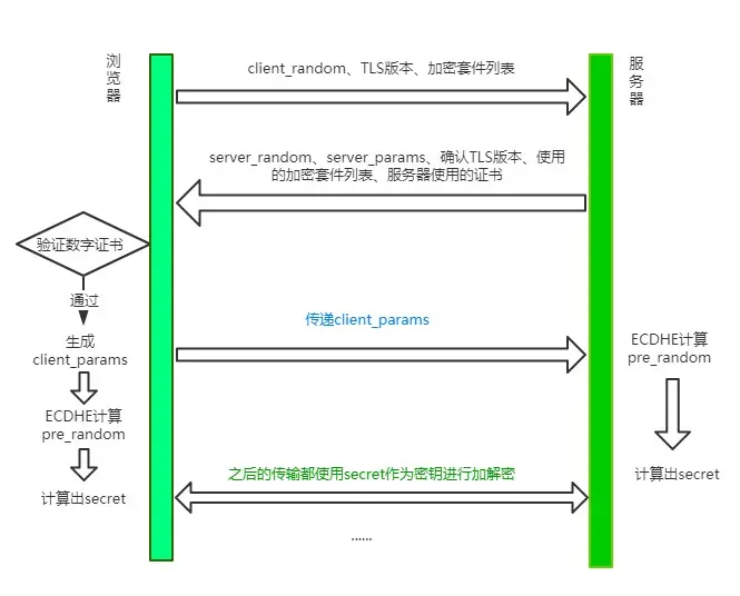 - 生成秘钥之后各自都会给对方一个收尾消息,告诉之后的传输都用这个秘钥进行对称加密,图中简化成一个双向箭头了。